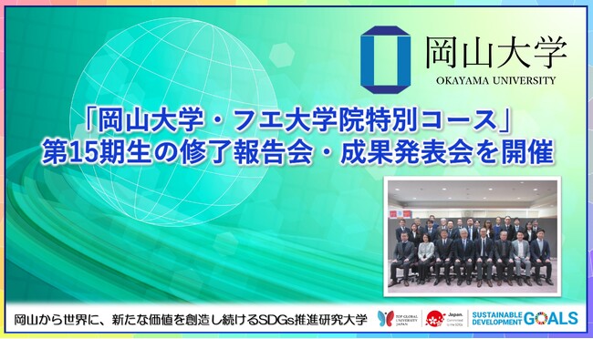国立大学法人岡山大学(本部:岡山市北区、学長:那須保友)は2024年3月7日、ベトナム・フエ大学との共同教育プログラム「岡山大学・フエ大学院特別コース」第15期生7人の修了報告会及び成果発表会を本学津島キャンパスの本部棟で開催しました。