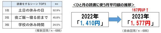 昨年、高校生の8割が読書をすると回答した「読書実態アンケート」。今年は、リアルな読書シーンを聞きました。すると、1位は「土日の休みの日」で5割を超え、2位は「夜ごはん〜寝る前まで」、3位「学校の休み時間」に。通学時間や通学前を抑え上位にランクインしたこれらは、短時間の隙間時間ではなく自由でゆったりした時間ともいえます。読書はじっくり時間を取ってやりたいこと、という心持ちなのでしょう。また、ひと月に本・漫画・雑誌に使う金額を聞くと、平均金額が「1,577円」と昨年よりも167円上昇していました。これは、昨今の物価上昇の波が紙媒体にも影響していると考えてよさそうです。