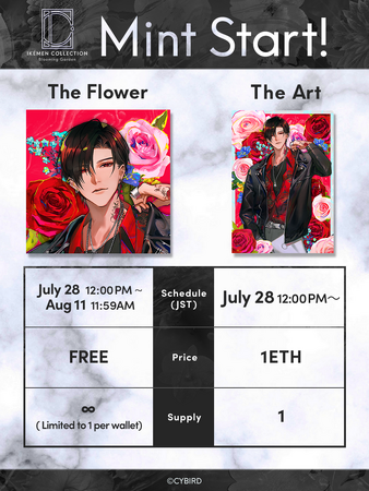 「IKÉMEN COLLECTION: Blooming Garden」の「ROSE」アートのフリーミント(無料でNFTが入手できる方法)と1/1アート販売を同時に開催します。