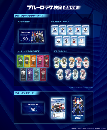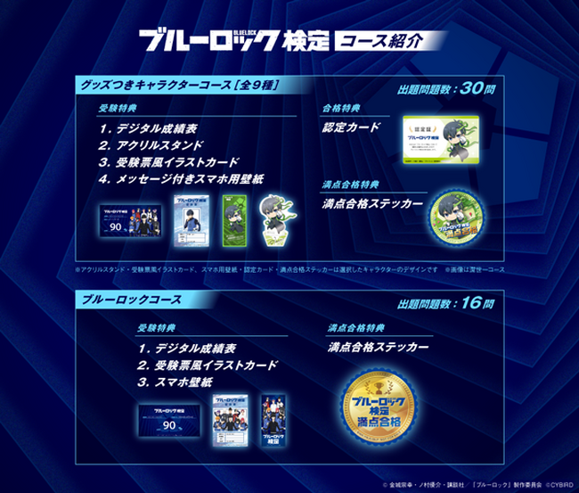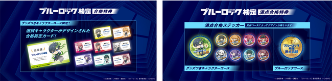グッズつきキャラクターコース(全9種)とブルーロックコース(全1種)から1つ選び検定に挑戦でき、ここでしか入手できない限定の特典を獲得できます。