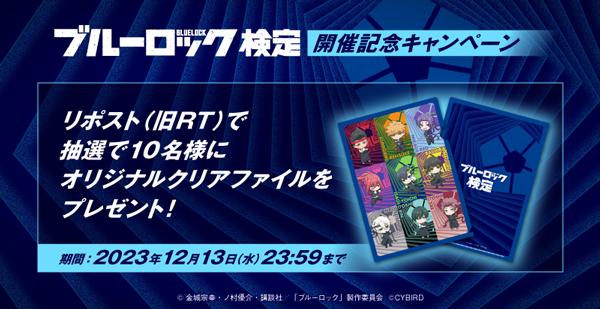 ブルーロック検定実施を記念して、描き起こしデザインを使用したクリアファイルが抽選で当たるキャンペーンを開催します。