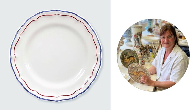 創業から200年を超える<ジアン>のコレクションの中でも、高度な技術を要する手描きのフィレシリーズのデザートプレートを<マムール>のオリジナルとしてトリコロールでお作りしました。