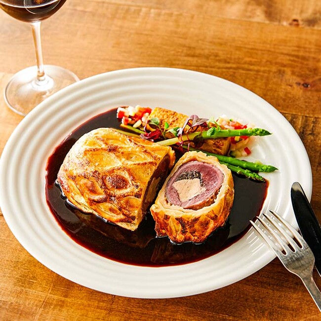 骨付きで熟成をかけ、旨みが凝縮した鹿ロース肉をフォアグラ・トリュフと一緒にパイで包み込んで焼き上げました。フレンチの技法をいかした付け合わせと秋を感じるトリュフを使用したペリグーソースを添えてご賞味ください。
