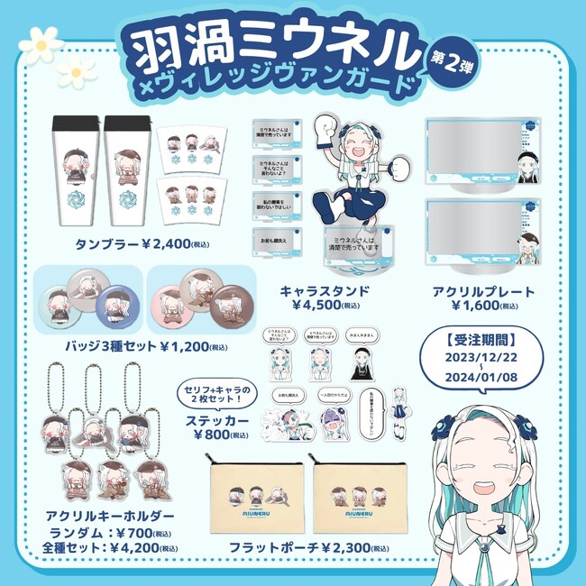 2023年12月22日(金)より、人気VTuber【羽渦ミウネル】とヴィレッジヴァンガードのコラボグッズ、大好評につき第2弾受注販売決定!!新たなミウネルさん描きおろしグッズは、いつもと違う姿!第1弾にはなかったアイテム中心の第2弾グッズをお楽しみください!2023年12月22日(金)〜2024年1月8日(月)の期間限定受注販売ですので、お見逃しなく!!