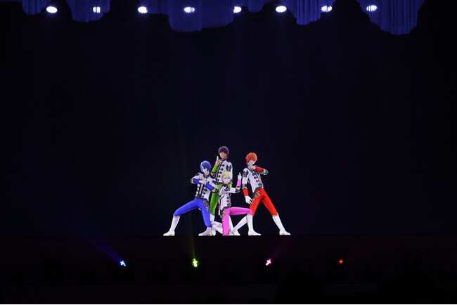 続いてはQUARTET NIGHTのターンへ。各メンバーのソロタイムでは、寿 嶺二の「Hurray×2ドリーマーズ」、黒崎蘭丸の「No.1」、カミュの「Double face」、美風 藍の「ムネノコドウ」の4曲を披露。夜公演では、歌い終えた4人がそれぞれの楽曲について話に花を咲かせた。嶺二がメンバーに、ハッピーな気分になれるという自身の曲の振り付けを「みんなもやってくれていいんだよ?」と提案するものの、蘭丸、藍、カミュの3人は同時に首を振る。嶺二が「振ってほしいのは首じゃないのに! いけず!」と返すと、その微笑ましい様子に会場から大きな笑いが起こった。そして、この4人でしか奏でられない最高の1曲として「Starlight Memory」を熱唱、フラッグを手にした力強いパフォーマンスで魅せた。