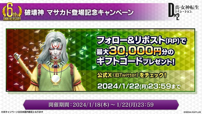 期間中、D2メガテン公式X(旧Twitter)アカウント(https://twitter.com/d2megaten)をフォローのうえ、1月18日(木)メンテナンス後以降に投稿される対象ポスト(ツイート)をリポスト(リツイート)した方の中から、抽選で合計11名様に「App StoreまたはGoogle Play ギフトコード(30,000円分1名様/3,000円分10名様)」が当たります。奮ってご参加ください!