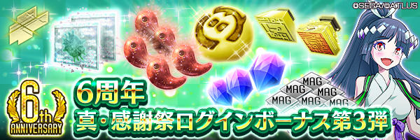 期間中のログインで、合計1,500ジェムや「カサネノマガタマ」「調印の霊判★6(メイン)」「潜在烙印片★6」などの豪華報酬がもれなく獲得できます。どうぞお見逃しなく!