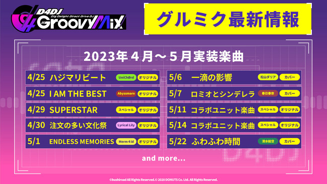 イベント連動楽曲に加え舞台D4DJ の楽曲2曲、ソロカバー楽曲3曲、さらにコラボユニット楽曲2曲の計10曲実装を予定です!