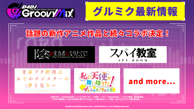 (C)bushiroad All Rights Reserved. (C) 2020 DONUTS Co. Ltd. All Rights Reserved. (C)逢沢大介・KADOKAWA刊/シャドウガーデン (C)竹町・トマリ/KADOKAWA/「スパイ教室」製作委員会 (C)Takemachi, Tomari/ KADOKAWA/ SPY ROOM Partners (C)2022 鴨志田 一/KADOKAWA/青ブタ Project (C)椋木ななつ・一迅社/わたてんプレフレ製作委員会