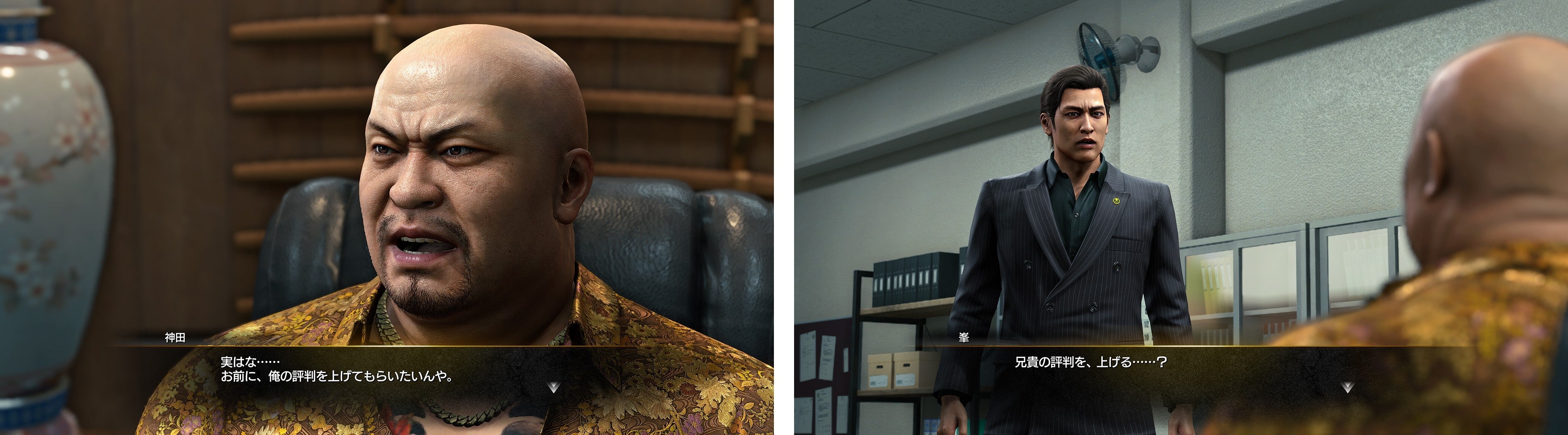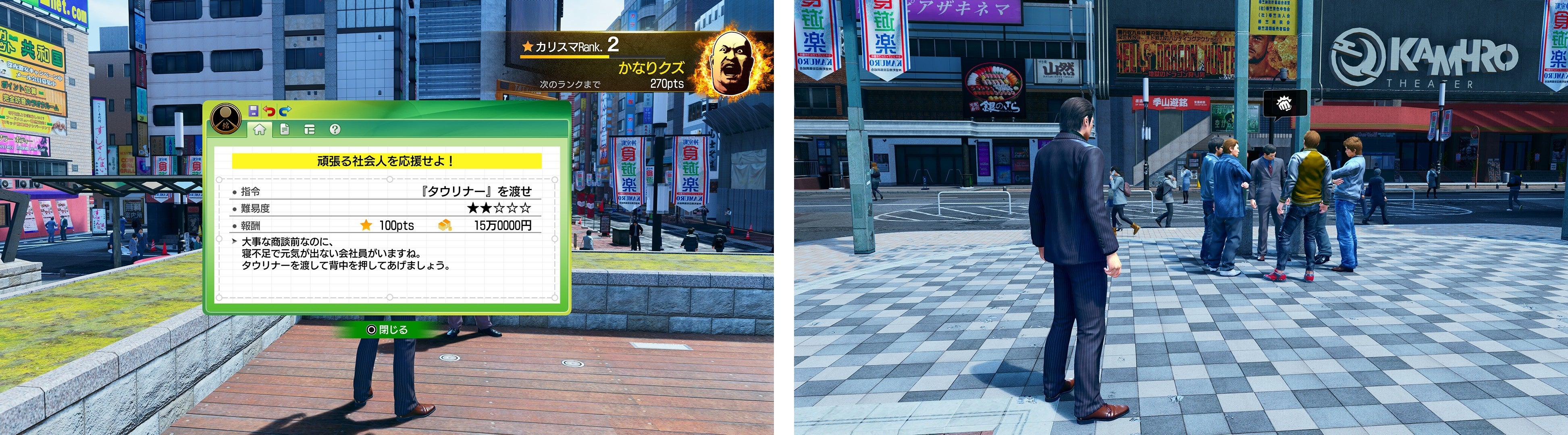 「カタギレスキュー」はその名の通り、街中で困っているカタギの人々を助けることで神田の評判を上げていくミッションだ。チンピラに絡まれている人から、くしゃみが止まらずに困っている人まで、様々な悩みを抱えた住民たちを助けに行こう!