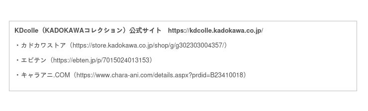 詳細は、「KDcolle(KADOKAWAコレクション)公式サイト」をご覧ください。また、カドカワストア、エビテン、キャラアニ.COMでは、予約も開始しております!