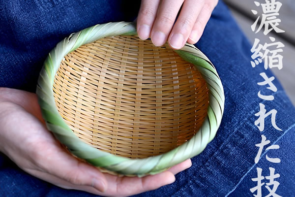 竹表皮を薄く剥ぐ「磨き」の加工を施した竹ヒゴで作られており、なめらかで優しい触り心地。時間がたつほどに飴色へと変わっていく経年変化をお楽しみください。直径約14センチと小さな竹ざるは、実は編むのが大変で難しい竹細工。細い竹ヒゴでみっちり丁寧に編まれていおり、縁巻きの巻き終わりは裏側の竹編みに仕舞い込んでいます。気配りが行き届いた国産・日本製の竹ざるなのです。