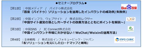 この4社が一堂に会し、それぞれの得意分野の情報を「中国のインバウンド需要の刈り取り」「ビジネスの拡大」「中国デジタルマーケテイング推進」などを支援するために講演し、1日で4社まとめて聴講できる貴重な機会となっております。