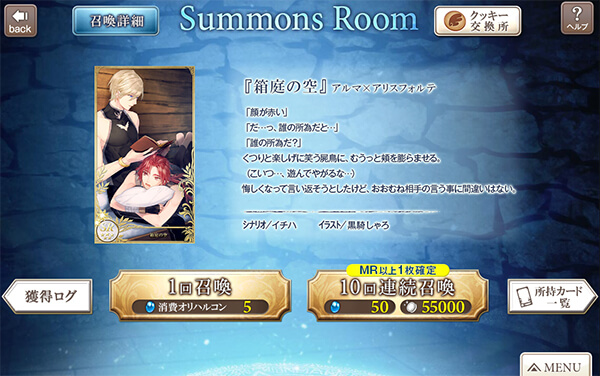 召喚カードは一回につきオリハルコン5個を消費し、十回連続召喚(オリハルコン50個消費)では必ず1枚はMR以上のレアリティが出現する確定枠が存在します。