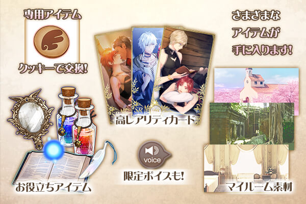手に入るクッキーの枚数は獲得レアリティによって変化し、クッキーを集める事で豪華アイテムや特別ボイスと交換することができます。