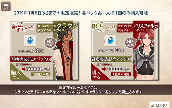 召喚カードを手に入れるのに必要なオリハルコンのセットに加え、こちらでしか獲得出来ない限定マイルームボイスも手に入れる事ができます。