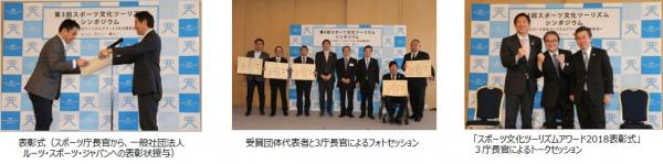 スポーツ庁、文化庁、観光庁(以下、3庁)では、3庁の政策連携による相乗効果によって、新たに生まれる地域ブランドや日本ブランドを確立・発信し、訪日観光客の増加や国内観光活性化を図るため、「スポーツ文化ツーリズムシンポジウム」プログラム内にて、「スポーツ文化ツーリズムアワード2018表彰式」にて、全国の応募の中からマイスター部門・チャレンジ部門 入賞の、計5選を表彰しました。