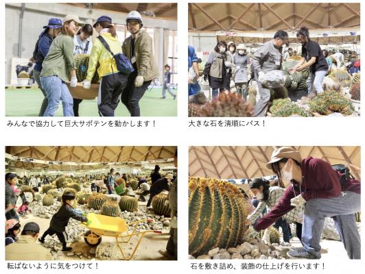 また、会場ブースパネルの壁面は、松本市立菅野中学校の美術部の生徒たちが描いた絵画を貼り、サボテンや石灰岩、流木の設営には、大人から子どもまで70名を越える地元信州の方々を中心としたボランティアスタッフにご参加いただき完成を迎えました。