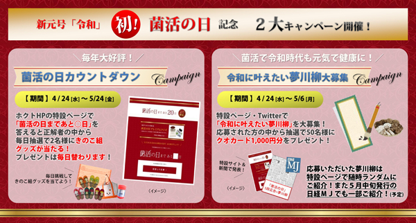 きのこ総合企業のホクト株式会社(所在地:長野県長野市、代表取締役社長 水野雅義)では、新たな時代“令和”になり初めておとずれる5月24日「菌活の日」を記念し、1ヶ月前となる4月24日から2大キャンペーンを実施中です。