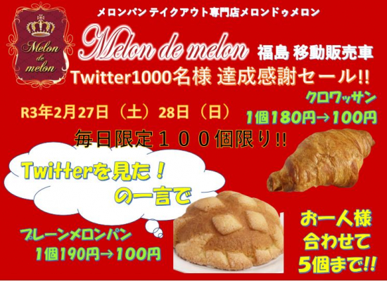 メロンパン専門店「Melon de melon( メロンドゥメロン )」(株式会社サンライズ、本社:東京都中央区、代表取締役社長:田中智也)の福島 移動販売車店では、2021年2月27日(土)と2月28日(日)の2日間にわたり『Twitterフォロワー1,000人突破大感謝セール』と致しまして、プレーンメロンパン、クロワッサンを100円で販売するキッチンカーイベントを開催致します。