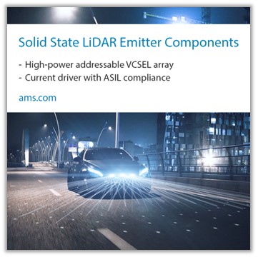 amsはオートモーティブグレードのVCSEL(面発光型半導体レーザー)アレイとドライバを提供し、エッジエミッターやLEDといった競合する光源よりも優れた信頼性と安定性を実現します。光ビームの方向を切り替える際に機械部品を必要とせず、信頼性を改善しつつ複雑性、寸法、重量、コストを削減できるソリッドステートLiDARにおいて、amsは照明ソリューションを販売する初の企業となります。高い信頼性とスモールフォームファクタのおかげで、ソリッドステートLiDARは自動車分野における大規模なLiDAR実装の道を開きます。