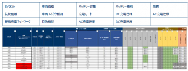 欧州、米国、中国市場で展開する各EVモデルの仕様や特性を一覧にしたエクセルデータベース:各モデルの下記項目を検索・比較することができます。