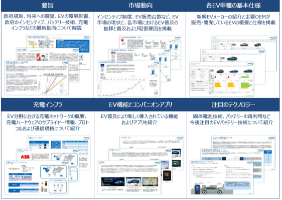 本書はEV動向をまとめたレポートとモデル別データベースファイルの2部構成になります。レポートでは充電インフラ、ビジネスモデル、環境への影響、関連政策やEVがもたらす現在および今後の機会についてまとめ、EVモデル別データベースでは仕様や特性を一覧にし、検索および比較することができます。