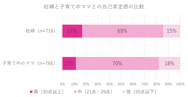子育て中ママ(n=766)の自己肯定感の割合をみてみると、高いグループに属するママは12%、低いグループに属するママは18%。妊婦と比較してみると、高いグループに属する割合は5ポイント低く、妊婦の自己肯定感の方がやや高いという結果になった。