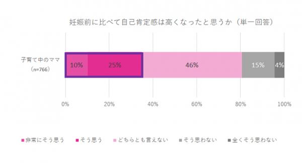 35%のママが「高くなった」と回答(「非常にそう思う=10%」+「そう思う=25%」=35%)していることから、妊娠や出産が女性の自己肯定感を向上させるきっかけとなるかもしれない。