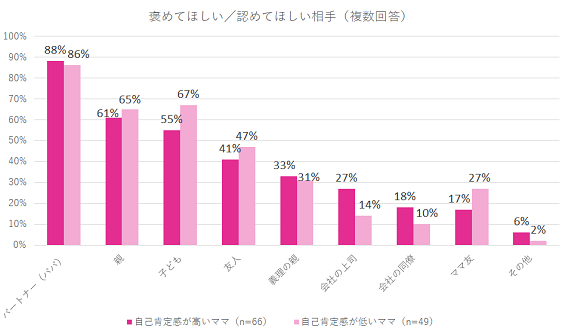 では、ママの自己肯定感を向上させるためにも、誰かに褒めてもらうことが有効にならないだろうか。そして、もし、褒めてもらえるなら誰から褒められたいのだろうか。「それはパートナー(パパ)だ!」と誰しもが真っ先に答えるだろう。実際、89%ものママがパートナー(パパ)に、褒めてほしい/認めてほしいと回答している。続いて、親(57%)、子ども(53%)、友人(39%)、義理の親(29%)、会社の上司(21%)、会社の同僚(17%)、ママ友(17%)という結果になった。