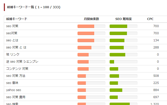例)キーワード:SEO対策と入力した場合