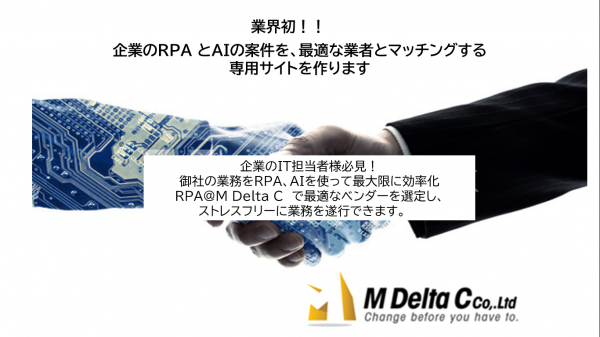 〜業界初!企業のRPAとAIの案件を、最適な業者とマッチングする専用サイトを作ります! 株式会社M Delta Cが、CAMPFIREのクラウドファンディングを通じて新しい挑戦を始めます!