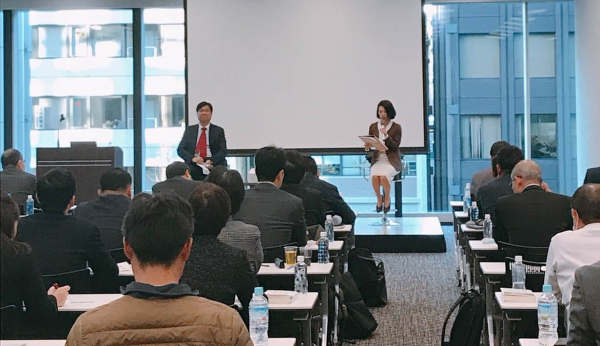 当日は、嶋氏の講演会と、嶋氏と当社取締役の東宮との対談という2部構成で開催されました。第1部では、嶋氏が、ソフトバンク(株)にて孫正義氏を補佐した経験から、「超一流のリーダーシップ」について説明しました。「世界が変化する方向性と時期を読み、行動を起こすことが重要である。今後、5Gのスタートにより、AI分野で大きな変化が起きるが、影響されない分野はない。このような将来を読み、自社、また自分自身が今すべきことは何なのか?を考えることが必要である。また成功の秘訣は、成功するまで諦めないことだ。」と話しました。