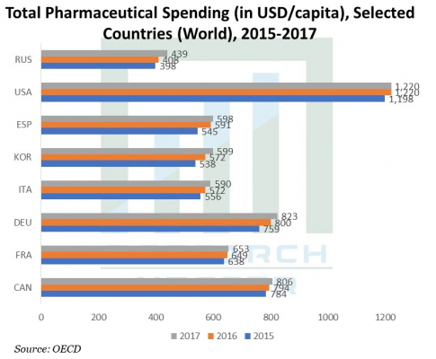 経済協力開発機構(OECD)のステータスによると、米国の医薬品支出は2015年の1198米ドル/人から2017年の1220米ドル/人に増加しました。