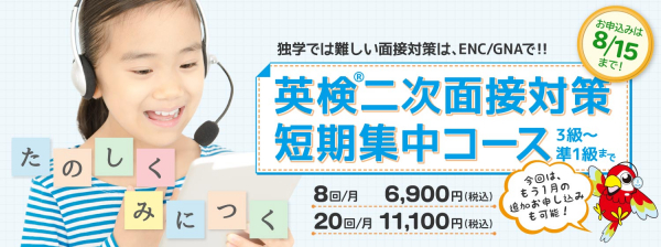 8月22日・23日英検(R)二次面接試験対策・オンライン英会話短期集中コース開講! 帰国子女ではない中学2年生が英検1級合格! ENC/GNA会員実績