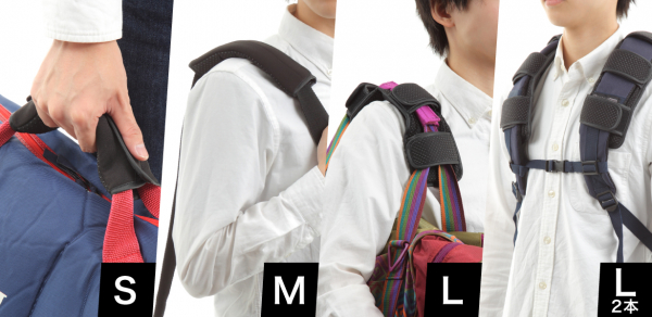 そしてホール構造の設計により「捻れ」「圧力」を吸収して、身体の形状に合わせ変形、肩への圧力を極限まで分散、軽減します。また、生地にも柔らかいネオプレーン素材を採用、中面と裏面に滑り止め加工を施し、ベルトをガッチリとホールド、肩からズレ、滑り落ちないように設計されています。サイズはS・M・Lの3つで手提げバッグ、リュック、ランドセルにも対応しています。デザインはシンプルにブラック基調となっています。