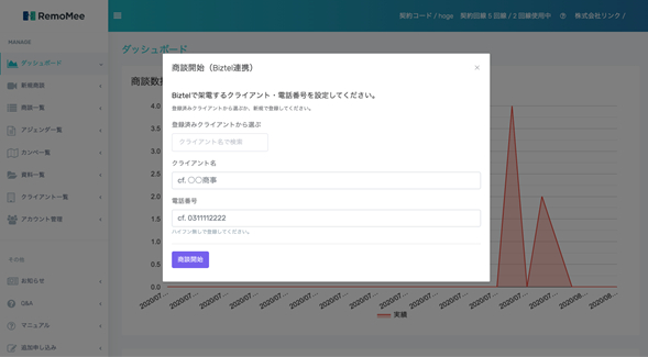 RemoMee の管理画面で「新規商談」をクリックすると、自動的に BIZTEL 連携画面が表示されます。登録済みクライアントから選択するか、新規クライアントの電話番号を入力して「商談開始」をクリックすることで BIZTEL から架電ができます。