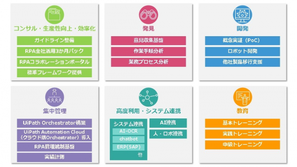 今回の新メニューの追加で「自動化可能な業務を漏れなく効率よく発見」「より広範囲な業務を高度に自動化」「自動化した業務を容易に集中管理」することが可能となりました。また、昨今のコロナ禍の状況を踏まえ、各サービスメニューをオンラインで利用できるよう対応しました。