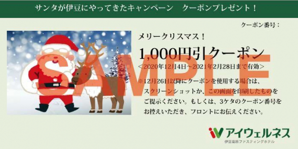 アイウェルネス伊豆高原ホームページ内にあるバーチャルホテルの中のどこかにいる“サンタクロース”を見つけると、宿泊が割引になるクーポンがもらえます。