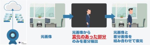 カメラデータの動きがあった部分だけを抽出してクラウドサーバに転送、復元・再生する、特許取得「差分転送」だから、ヒトやモノの動きが一目瞭然です。侵入者の動きや盗難、置き忘れなどを瞬時に検知できます。