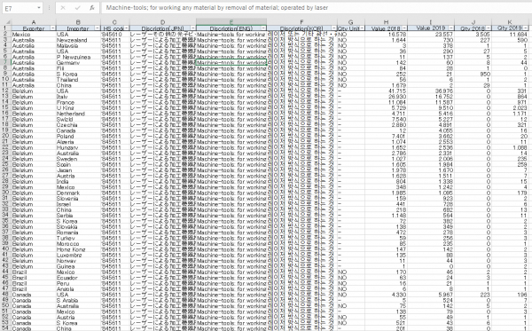 貿易商社やグローバル企業で工作機械の輸出入に関わっている方や、シンクタンクや政府機関において、同品目動向を調査している方などに最適のデータベースです。いつ、どの国とどの国で、どんなモノが、いかほど取引されたのか?平均単価も含むそのような数字は、利益に直結するインテリジェンスです。工作機械をめぐる海外ビジネスに携わる方には必須の武器となります。論より数字、勘より統計です。統計学を用いたデータサイエンスにも用いることができます。工作機械に関する貿易データセットが丸ごと入手できます。