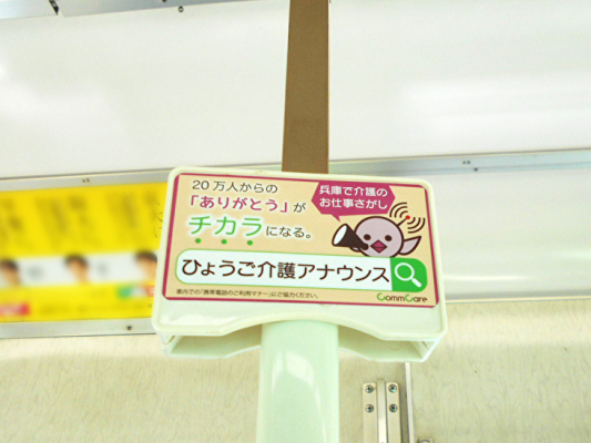 株式会社コムケア(代表:芝吹希代志)が運営する、兵庫の介護求人に特化した「地域密着サポート CommCare(コムケア)」の求人情報サイト「ひょうご介護アナウンス」は、2021年3月より神戸電鉄につり革広告を掲出中です。『介護ってしんどい。でも20万人からの「ありがとう」がチカラになる』をテーマに、兵庫の介護事業者と求職者を応援します。