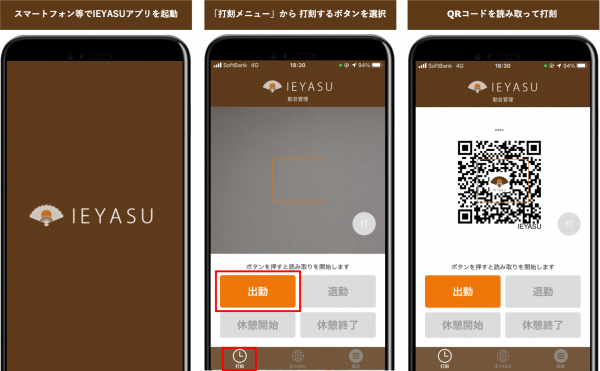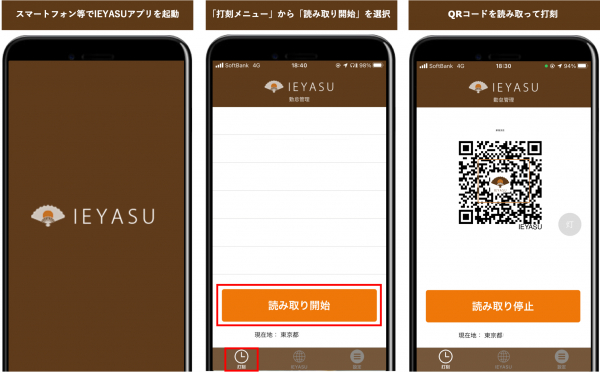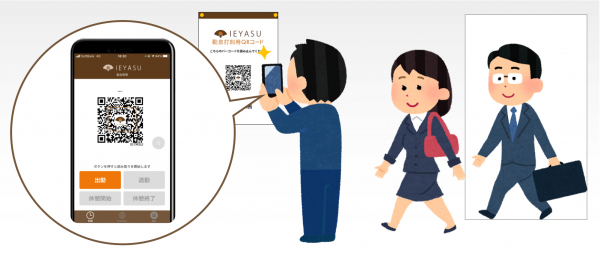 従業員は、自身のスマートフォンで「IEYASU利用者用アプリ」を立ち上げ、事業場に掲示されたQRコードを読み取って打刻します。