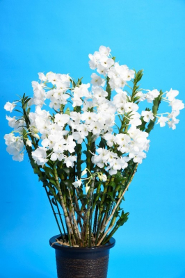 今年の大賞花はまず、抜けるように白く美しい色彩が一番のポイントでした。また、スジの入りやすい品種にもかかわらず、ほぼ入っていないのは、長年の交配によるものです。真っ白な美しい花がすべて正面を向いていて、とてもバランスよく仕立てられています。花芽の伸び始めから支柱とワイヤーで、丁寧に仕立てた証です。