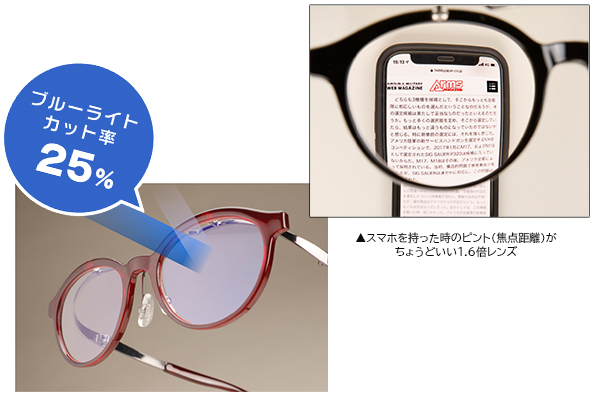 「スマホグラス」では、スマホを持った時のピント(焦点距離)がちょうど良い1.6倍レンズを採用。レンズ両面に施したARコートにより、ブルーライトを25%カット。また、光の反射量も軽減します。
