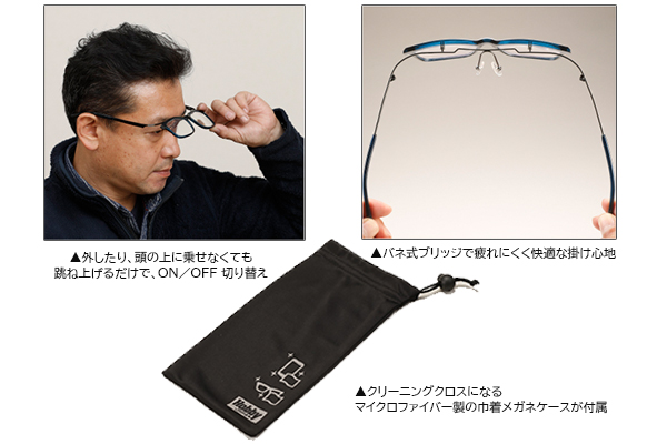 さらに、薄型軽量レンズを採用することにより、跳ね上げギミックを付けながらも軽量化(ウエリントン型で32.1g、ボストン型で32.4g)いたしました。ブリッジからテンプルにかけてバネが利いているので疲れにくく、さまざまなお顔にフィットします。