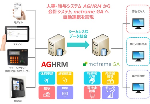クラウド対応のAGHRM/mcframe GA間でデータ連携機能を開発しました(mcframe GA、AGHRMともにオンプレミス導入にも対応)。これにより、AGHRMで処理した給与支払や経費精算のデータをmcframe GAに会計仕訳として連携することが可能です。クラウドの特性を活かして、執務場所を問わず業務遂行が可能です。専用インターフェイスによる連携のため、同じ情報の二重入力が排除される等、業務効率の向上が見込めます。