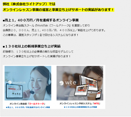 実際に弊社が自社で運営しているオンライン英会話サービスを例に、ホームページの立ち上げ、講師の採用、会員集客などの具体的な方法や運営のノウハウなどをご紹介させていただいております。