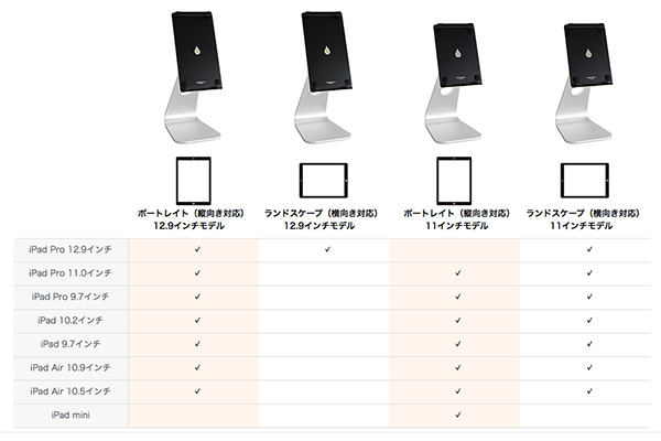 * mStand tablet proには、12.9インチモデルと11インチモデルがあり、iPad Pro 12.9インチからiPad miniまで対応します。