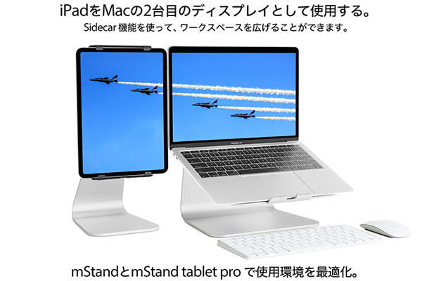 * iPadを目の高さへリフトアップし、mStandへ載せたMacBookのセカンドディスプレーとして正しい位置へセッティング出来ます。